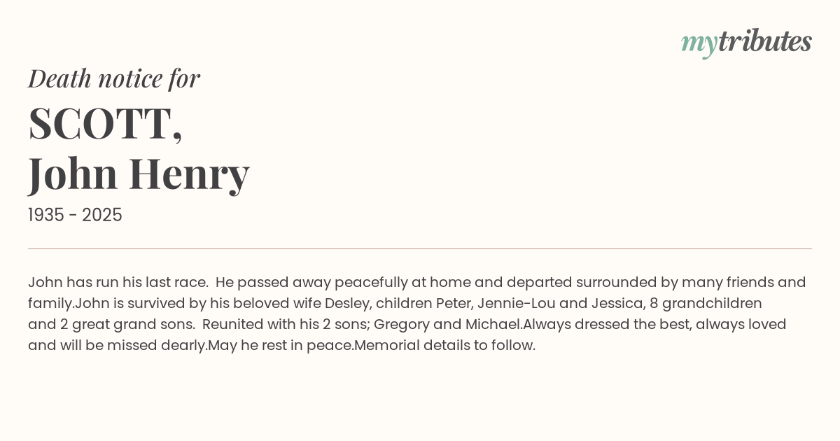 John is survived by his beloved wife Desley, children Peter, Jennie-Lou and Jessica, 8 grandchildren and 2 great grand sons. Reunited with his 2 sons; Gregory and Michael.