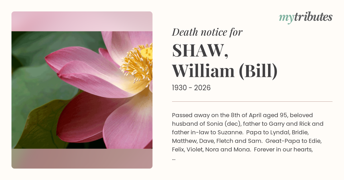 Passed away on the 8th of April aged 95, beloved husband of Sonia (dec), father to Garry and Rick and father in-law to Suzanne. Papa to Lyndal, Bridie, Matthew, Dave, Fletch and Sam. Great-Papa to Edie, Felix, Violet, Nora and Mona. Forever in our hearts, will be sadly missed.