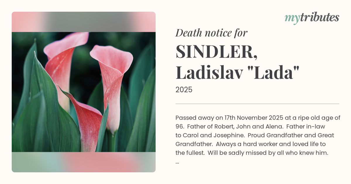 Passed away on 17th November 2025 at a ripe old age of 96. Father of Robert, John and Alena. Father in-law to Carol and Josephine. Proud Grandfather and Great Grandfather. Always a hard worker and loved life to the fullest. Will be sadly missed by all who knew him.