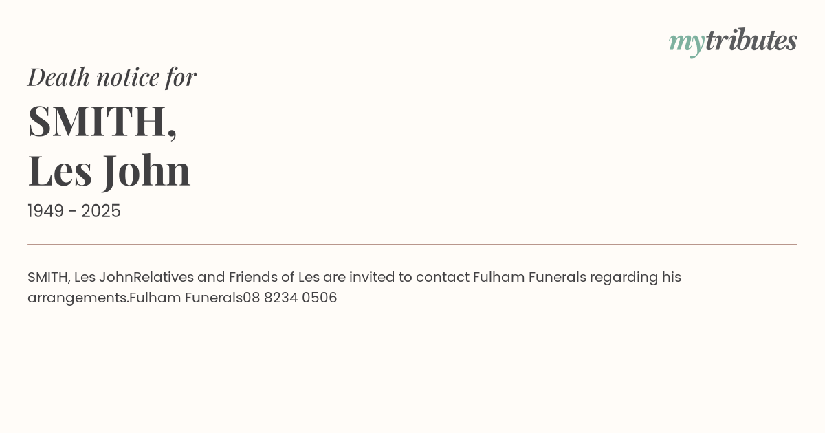 Relatives and Friends of Les are invited to contact Fulham Funerals regarding his arrangements.