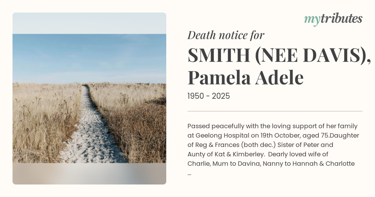 Daughter of Reg & Frances (both dec.) Sister of Peter and Aunty of Kat & Kimberley. Dearly loved wife of Charlie, Mum to Davina, Nanny to Hannah & Charlotte and dear friend of Grant, Andrew & Jesse. Forever in our hearts.
