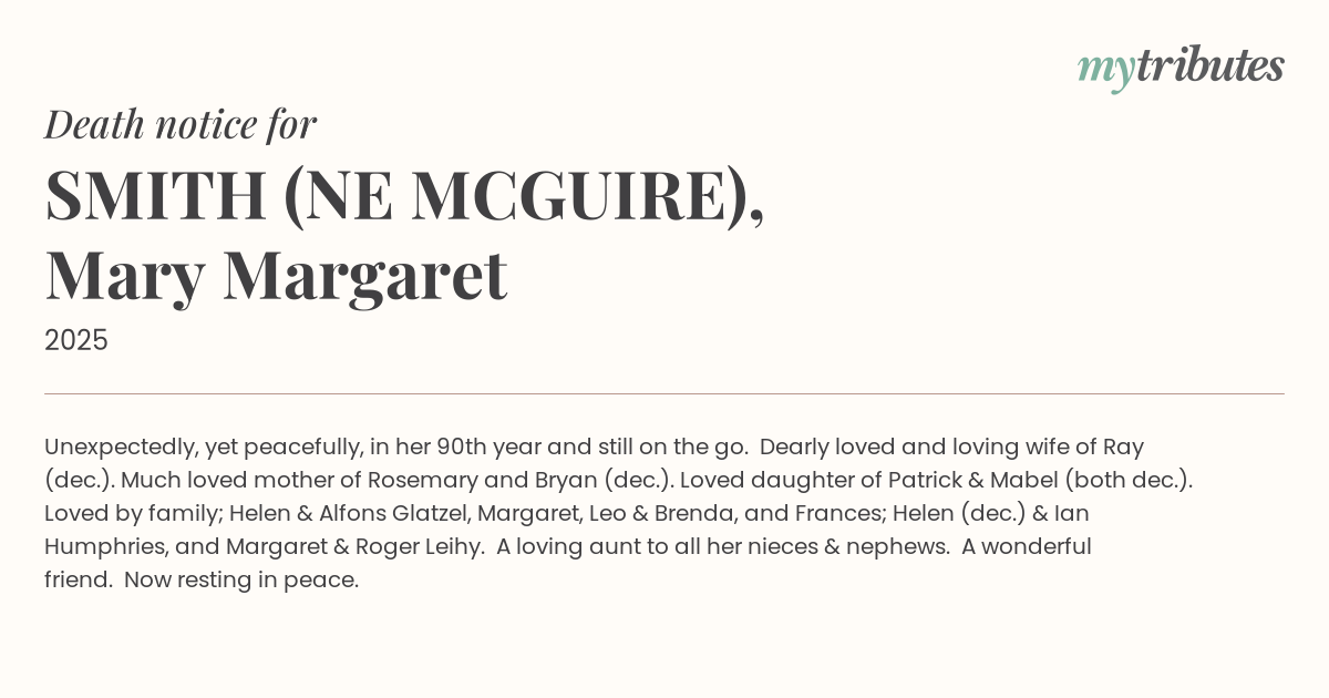 Loved daughter of Patrick & Mabel (both dec.).