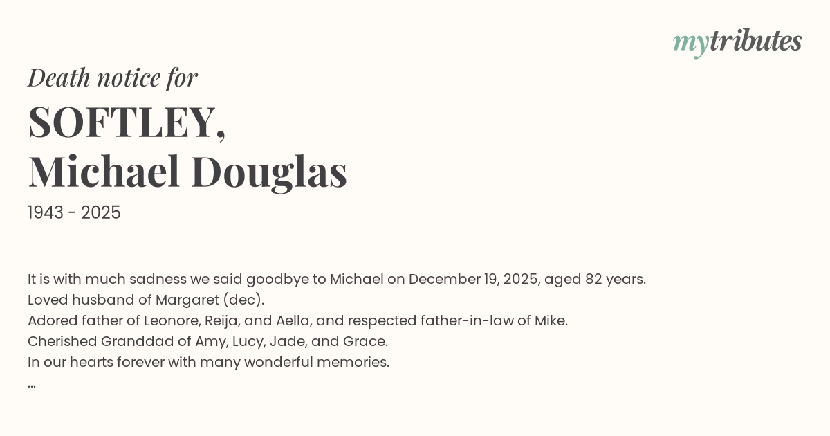 It is with much sadness we said goodbye to Michael on December 19, 2025, aged 82 years.
