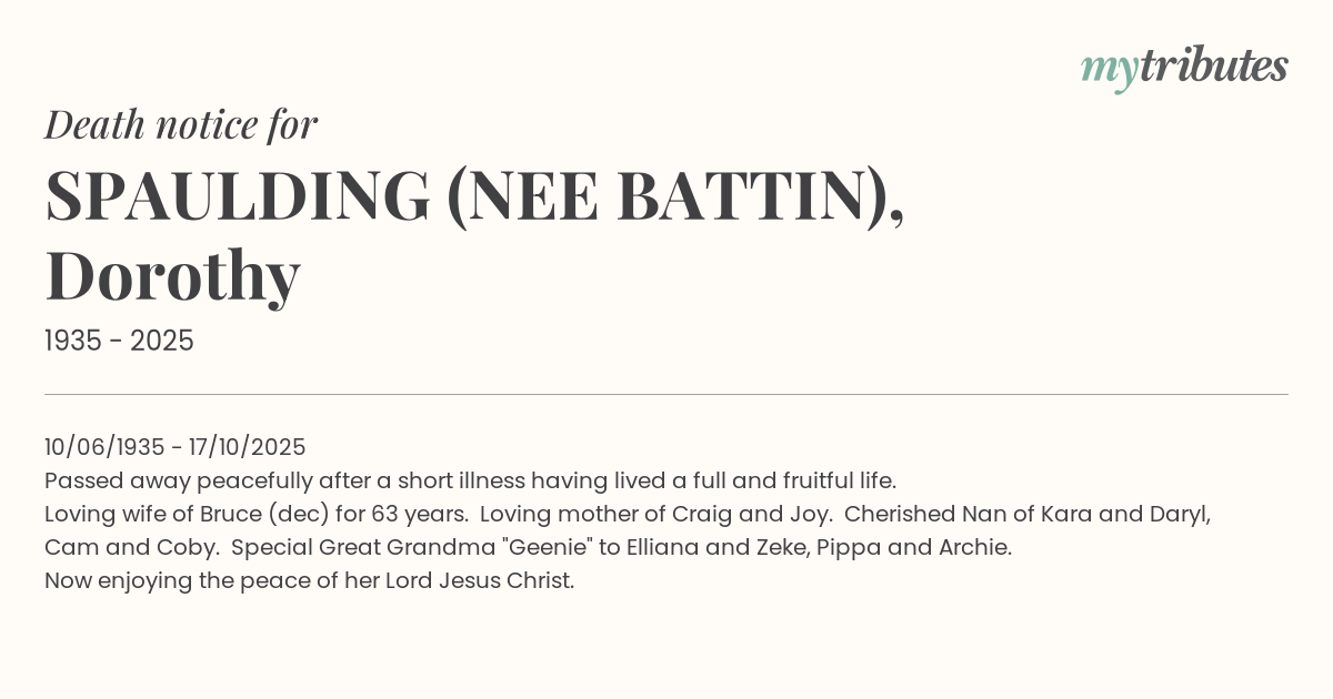Loving wife of Bruce (dec) for 63 years. Loving mother of Craig and Joy. Cherished Nan of Kara and Daryl, Cam and Coby. Special Great Grandma "Geenie" to Elliana and Zeke, Pippa and Archie.