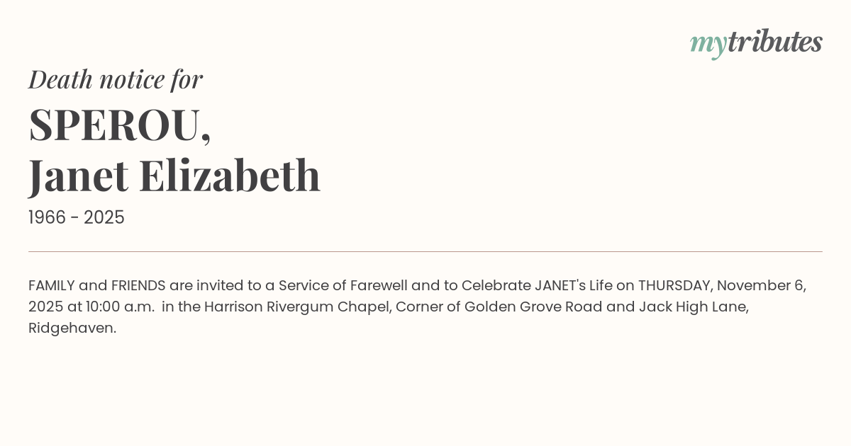 FAMILY and FRIENDS are invited to a Service of Farewell and to Celebrate JANET's Life on THURSDAY, November 6, 2025 at 10:00 a.m. in the Harrison Rivergum Chapel, Corner of Golden Grove Road and Jack High Lane, Ridgehaven.