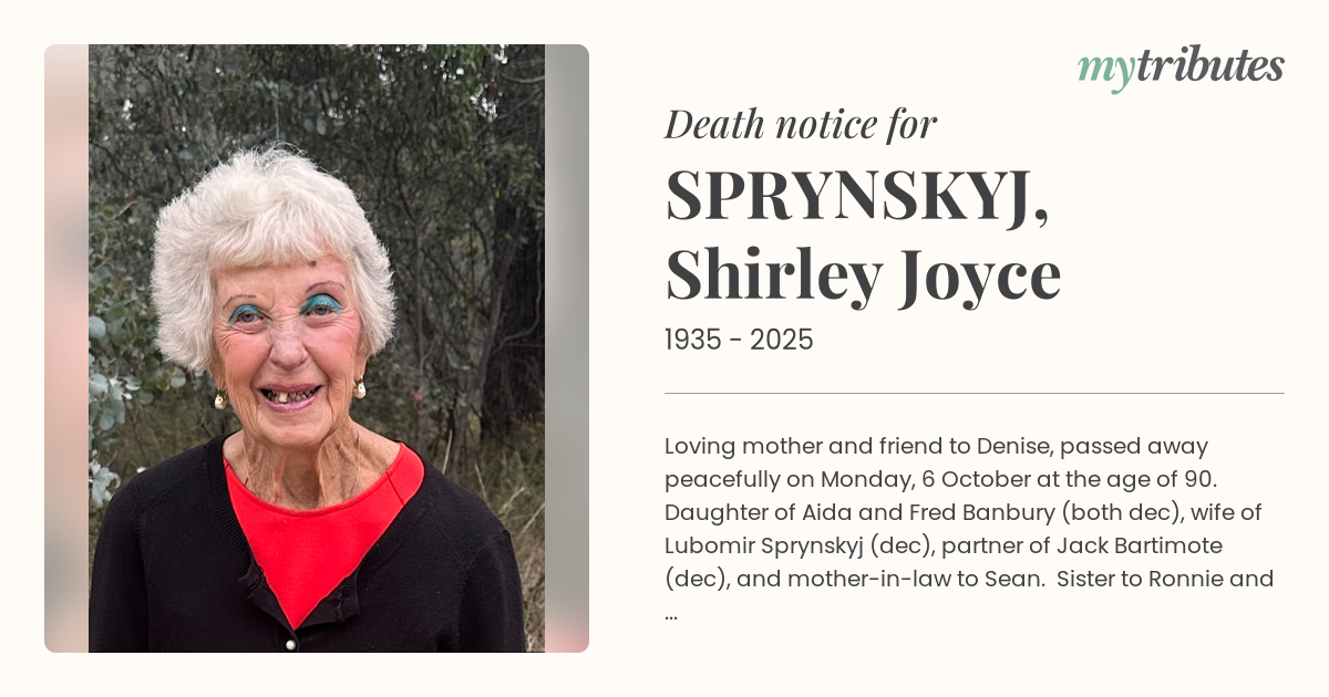 Daughter of Aida and Fred Banbury (both dec), wife of Lubomir Sprynskyj (dec), partner of Jack Bartimote (dec), and mother-in-law to Sean.