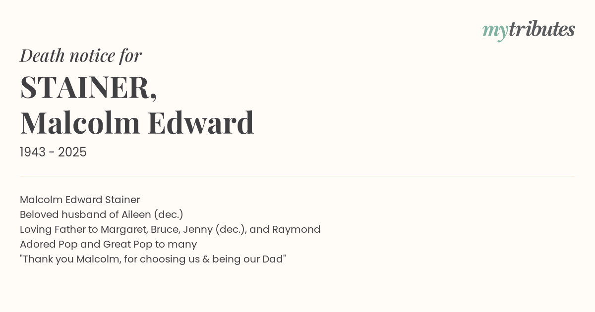 Loving Father to Margaret, Bruce, Jenny (dec.), and Raymond