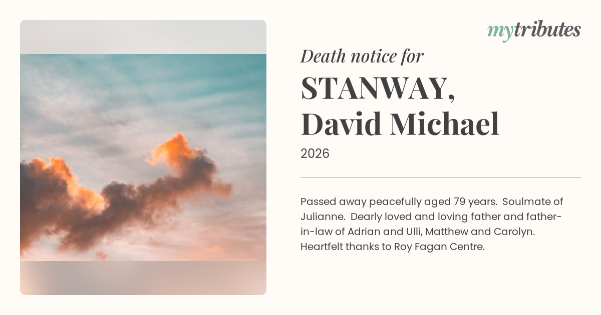 Passed away peacefully aged 79 years. Soulmate of Julianne. Dearly loved and loving father and father-in-law of Adrian and Ulli, Matthew and Carolyn. Heartfelt thanks to Roy Fagan Centre.
