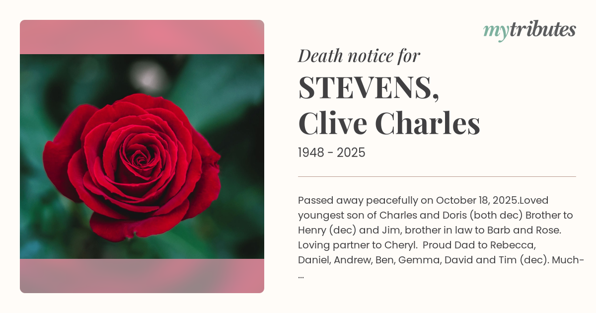 Loved youngest son of Charles and Doris (both dec) Brother to Henry (dec) and Jim, brother in law to Barb and Rose. Loving partner to Cheryl. Proud Dad to Rebecca, Daniel, Andrew, Ben, Gemma, David and Tim (dec). Much-loved Poppy to Alex, Jack, Gillian, Jonty, Mae, Max, Hudson, Austin, Henry and Ann; and their families. Heartfelt thanks to Cheryl for her loving care of Dad at home. No service. In lieu of flowers, donations to The Wilderness Society (wilderness.org.au/clive)