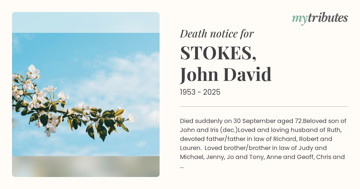 Loved and loving husband of Ruth, devoted father/father in law of Richard, Robert and Lauren. Loved brother/brother in law of Judy and Michael, Jenny, Jo and Tony, Anne and Geoff, Chris and Lisa. Loving son in law of Arvon. A friend to so many, John will be greatly missed.