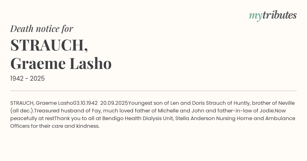 Youngest son of Len and Doris Strauch of Huntly, brother of Neville (all dec.).