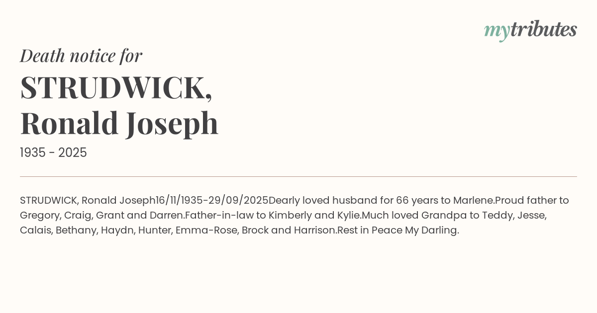Much loved Grandpa to Teddy, Jesse, Calais, Bethany, Haydn, Hunter, Emma-Rose, Brock and Harrison.