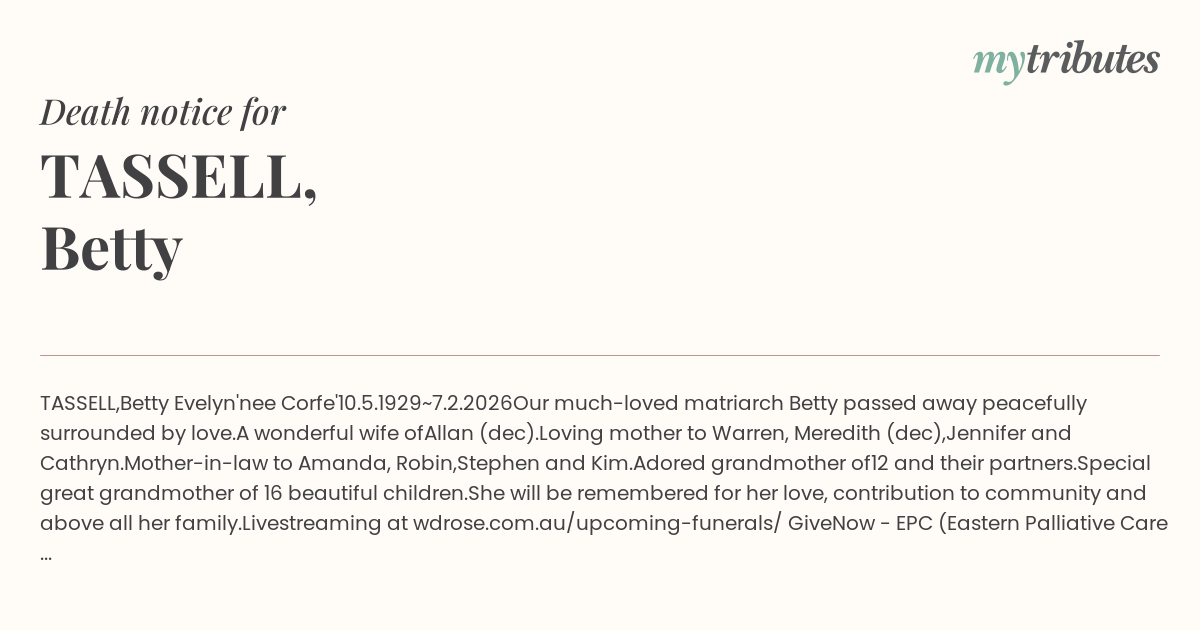 Our much-loved matriarch Betty passed away peacefully surrounded by love.