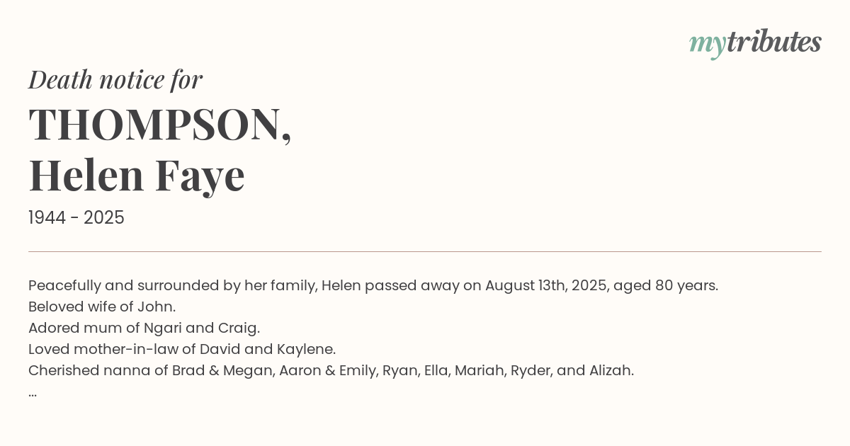 Peacefully and surrounded by her family, Helen passed away on August 13th, 2025, aged 80 years.