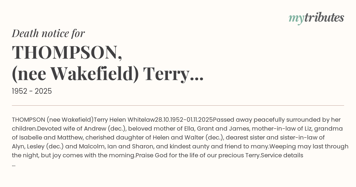 Devoted wife of Andrew (dec.), beloved mother of Ella, Grant and James, mother-in-law of Liz, grandma of Isabelle and Matthew, cherished daughter of Helen and Walter (dec.), dearest sister and sister-in-law of Alyn, Lesley (dec.) and Malcolm, Ian and Sharon, and kindest aunty and friend to many.