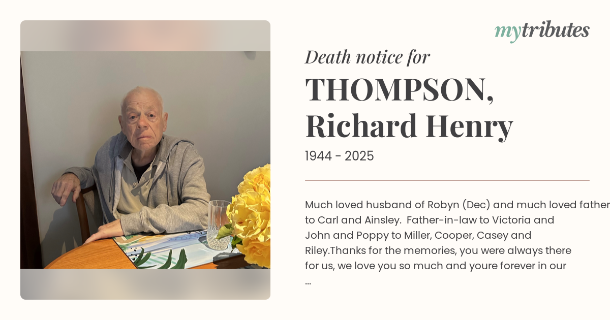 Much loved husband of Robyn (Dec) and much loved father to Carl and Ainsley. Father-in-law to Victoria and John and Poppy to Miller, Cooper, Casey and Riley.