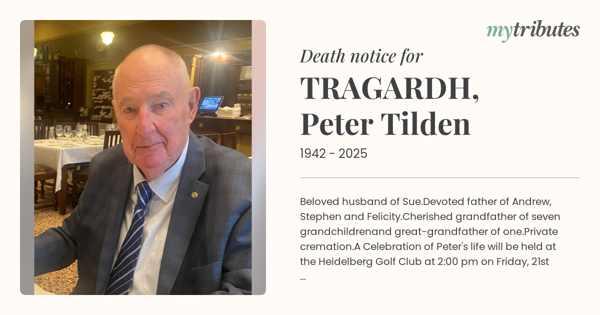 A Celebration of Peter's life will be held at the Heidelberg Golf Club at 2:00 pm on Friday, 21st November 2025.