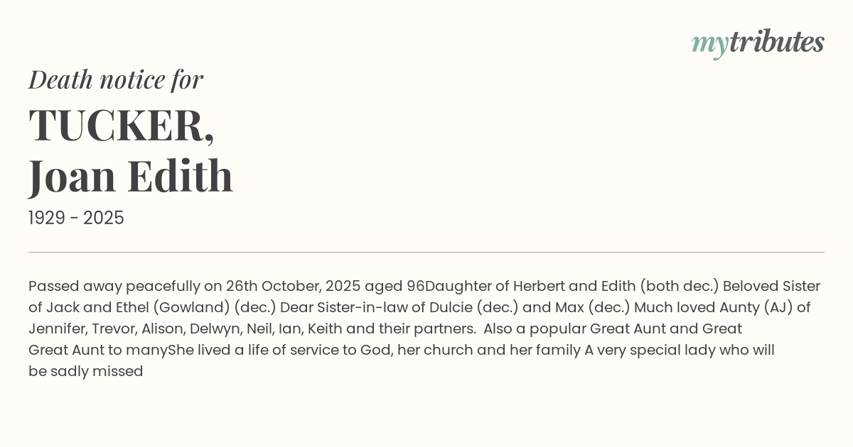 Much loved Aunty (AJ) of Jennifer, Trevor, Alison, Delwyn, Neil, Ian, Keith and their partners. Also a popular Great Aunt and Great Great Aunt to many