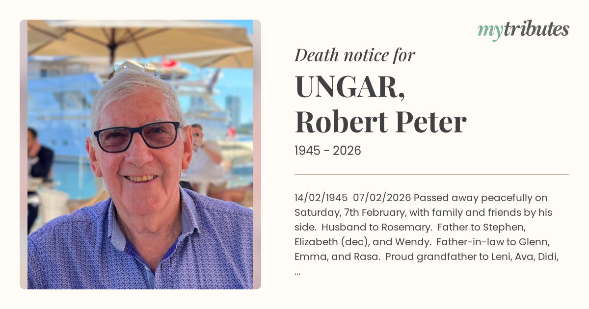 14/02/1945 – 07/02/2026 Passed away peacefully on Saturday, 7th February, with family and friends by his side. Husband to Rosemary. Father to Stephen, Elizabeth (dec), and Wendy. Father-in-law to Glenn, Emma, and Rasa. Proud grandfather to Leni, Ava, Didi, Gemma, and Alby. Brother to Mary and Sue (dec). His life is an inspiration on how to live well, with courage, humility, perseverance, warmth, and a wicked sense of humour. He will be sorely missed however, leaves us all with the legacy of the example he set and the many people he touched, and we will all flourish because of it. In lieu of flowers please consider a donation to the Leukaemia Foundation.