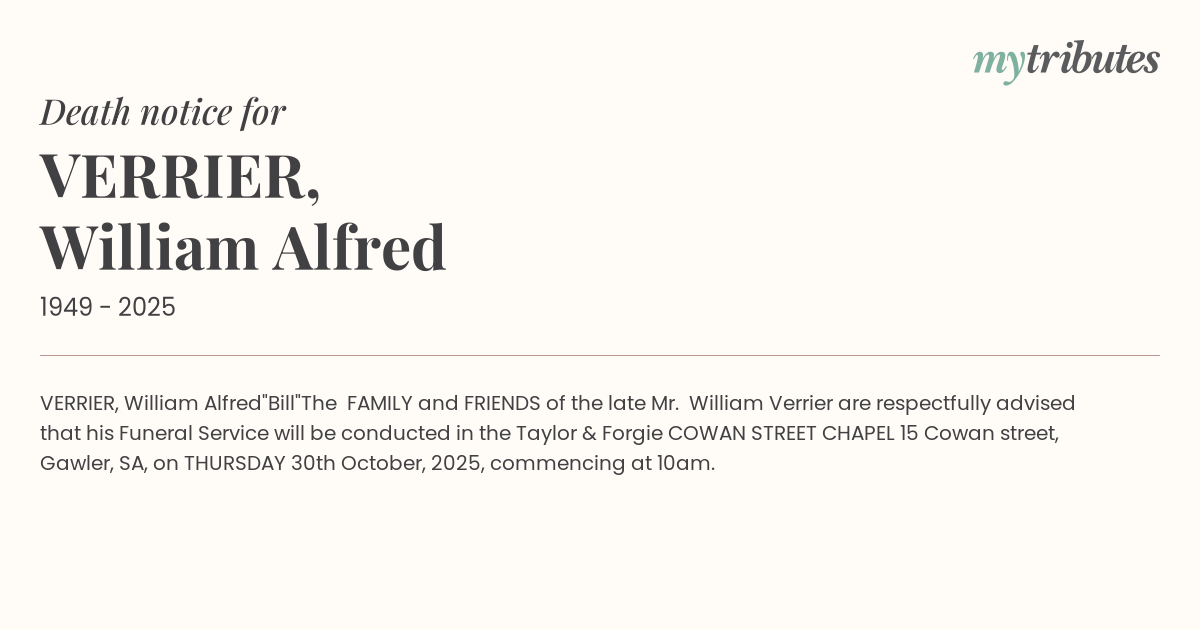 Mr. William Verrier are respectfully advised that his Funeral Service will be conducted in the