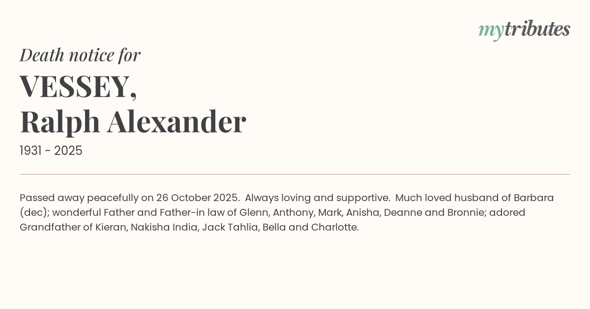Passed away peacefully on 26 October 2025. Always loving and supportive. Much loved husband of Barbara (dec); wonderful Father and Father-in law of Glenn, Anthony, Mark, Anisha, Deanne and Bronnie; adored Grandfather of Kieran, Nakisha India, Jack Tahlia, Bella and Charlotte.