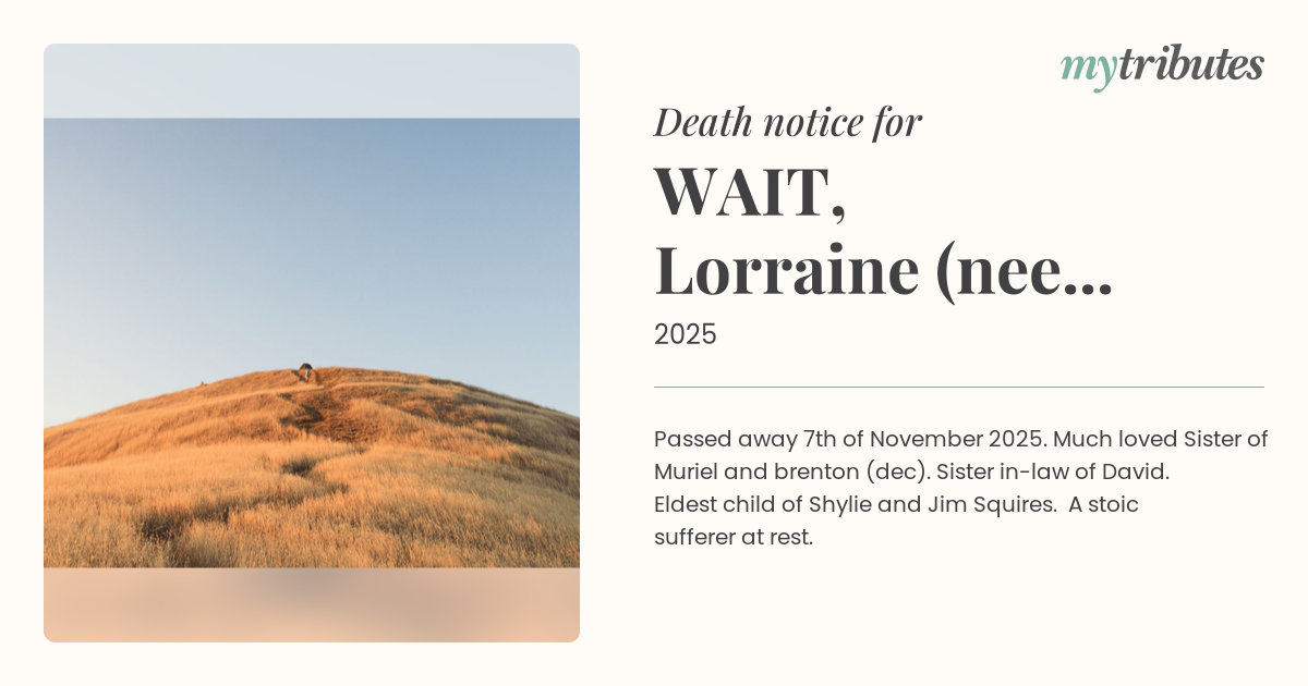 Passed away 7th of November 2025. Much loved Sister of Muriel and brenton (dec). Sister in-law of David.