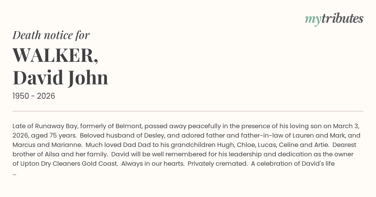 Late of Runaway Bay, formerly of Belmont, passed away peacefully in the presence of his loving son on March 3, 2026, aged 75 years. Beloved husband of Desley, and adored father and father-in-law of Lauren and Mark, and Marcus and Marianne. Much loved Dad Dad to his grandchildren Hugh, Chloe, Lucas, Celine and Artie. Dearest brother of Ailsa and her family. David will be well remembered for his leadership and dedication as the owner of Upton Dry Cleaners Gold Coast. Always in our hearts. Privately cremated. A celebration of David's life will be held at a later date, to be advised.