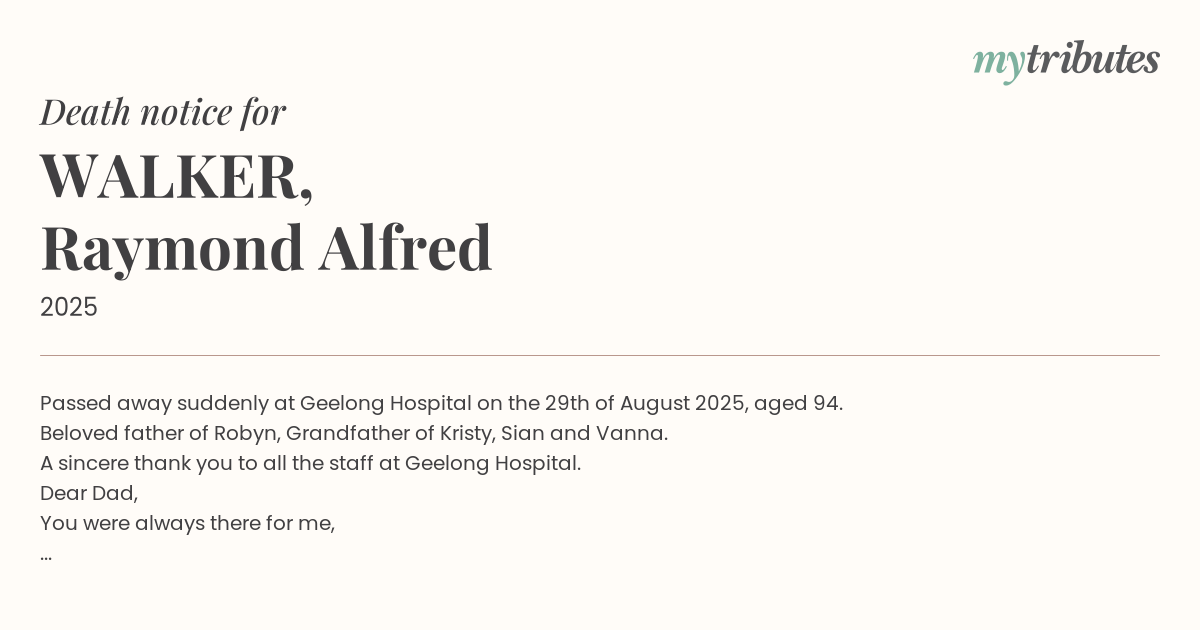 Passed away suddenly at Geelong Hospital on the 29th of August 2025, aged 94.