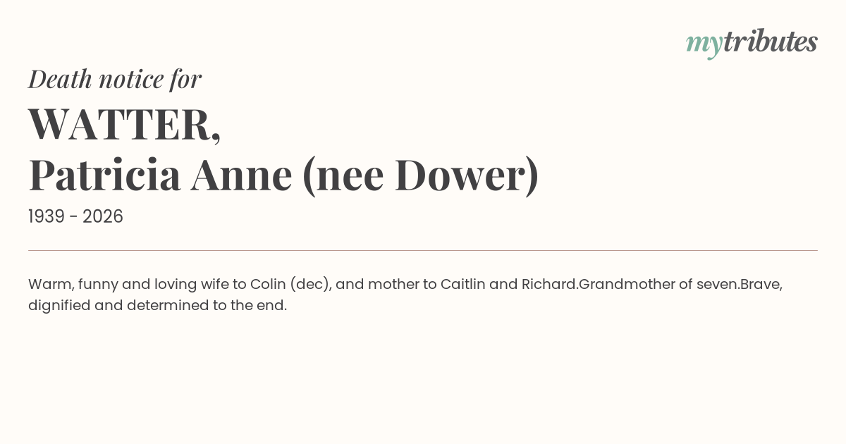 Warm, funny and loving wife to Colin (dec), and mother to Caitlin and Richard.