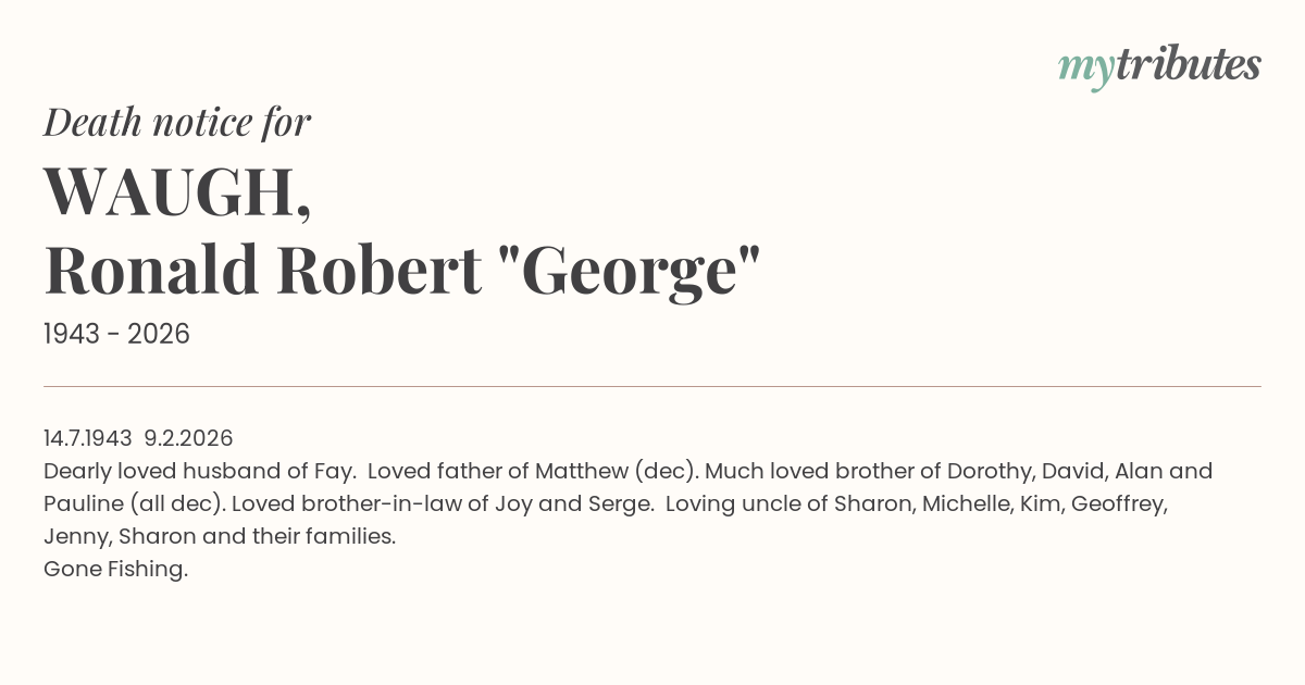 Dearly loved husband of Fay. Loved father of Matthew (dec). Much loved brother of Dorothy, David, Alan and Pauline (all dec). Loved brother-in-law of Joy and Serge. Loving uncle of Sharon, Michelle, Kim, Geoffrey, Jenny, Sharon and their families.