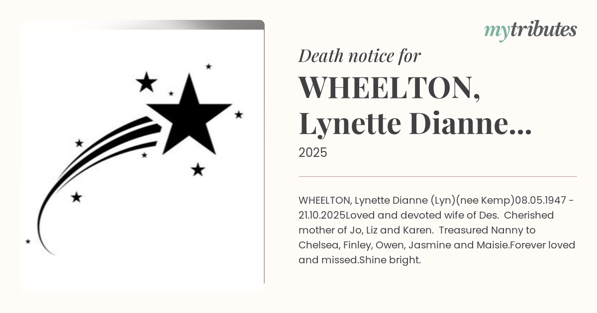 Loved and devoted wife of Des. Cherished mother of Jo, Liz and Karen. Treasured Nanny to Chelsea, Finley, Owen, Jasmine and Maisie.