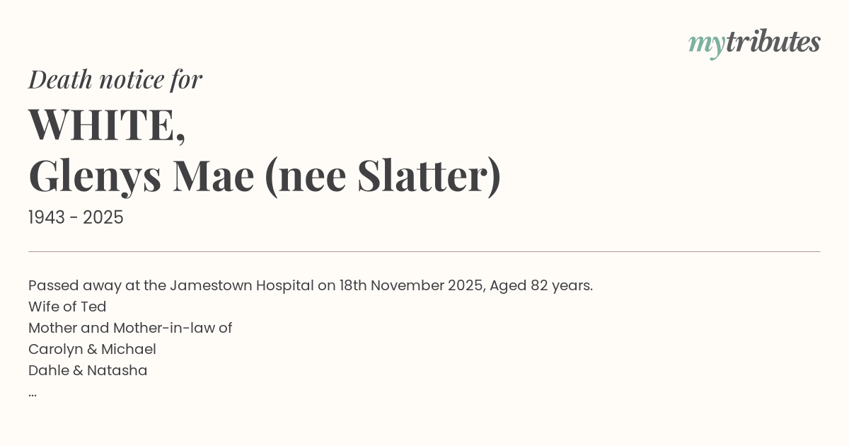 Passed away at the Jamestown Hospital on 18th November 2025, Aged 82 years.