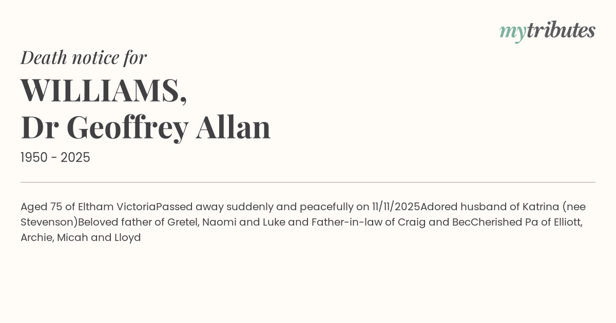 Beloved father of Gretel, Naomi and Luke and Father-in-law of Craig and Bec