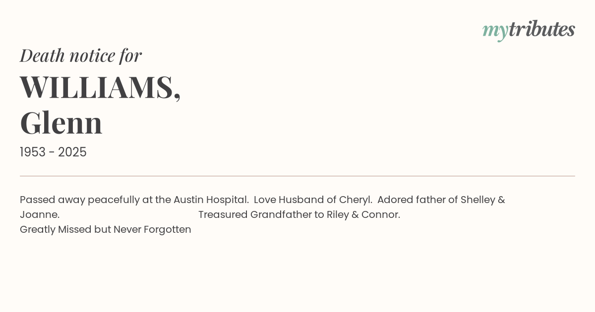 Passed away peacefully at the Austin Hospital. Love Husband of Cheryl. Adored father of Shelley & Joanne. Treasured Grandfather to Riley & Connor. Greatly Missed but Never Forgotten