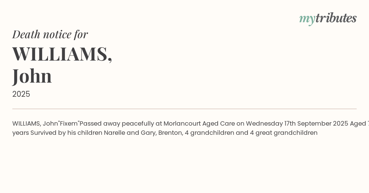 Survived by his children Narelle and Gary, Brenton,