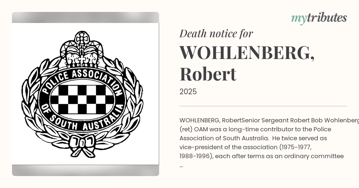 Senior Sergeant Robert “Bob” Wohlenberg (ret) OAM was a long-time contributor to the Police Association of South Australia. He twice served as vice-president of the association (1975-1977, 1988-1996), each after terms as an ordinary committee member. For his long and distinguished service, in the interests of his colleagues, Bob received the honour of Police Association life membership in 1996.