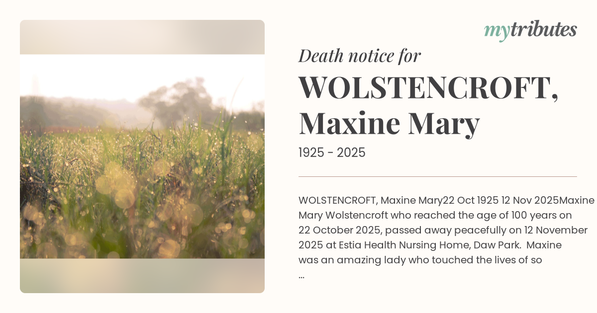 Maxine Mary Wolstencroft who reached the age of 100 years on 22 October 2025, passed away peacefully on