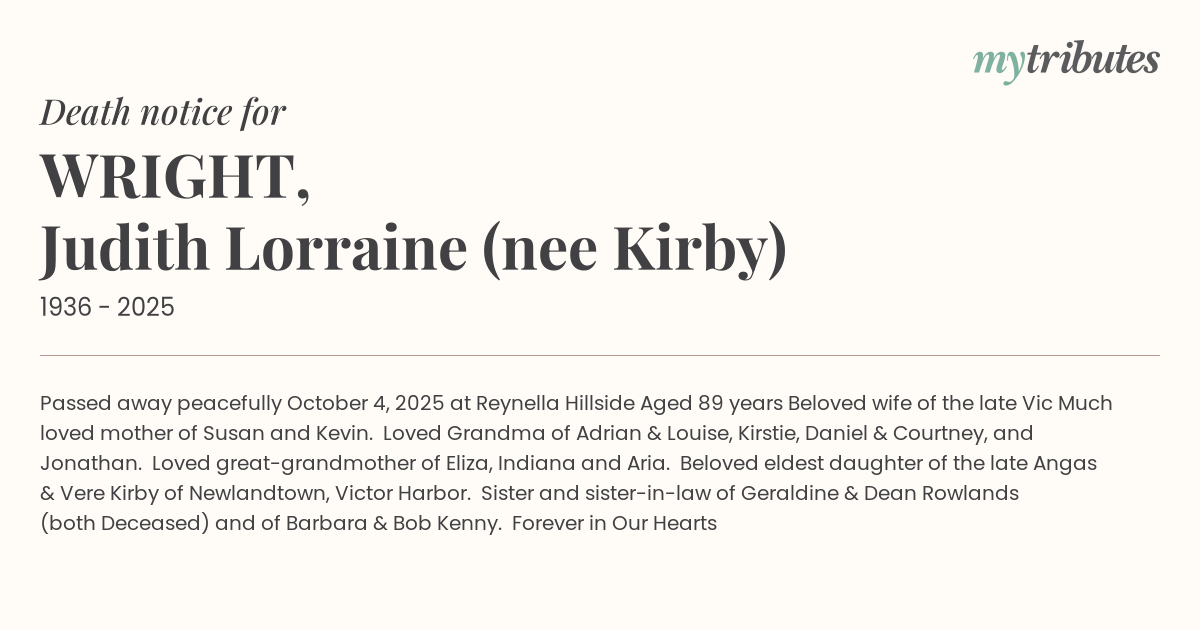 Sister and sister-in-law of Geraldine & Dean Rowlands (both Deceased) and of Barbara & Bob Kenny.