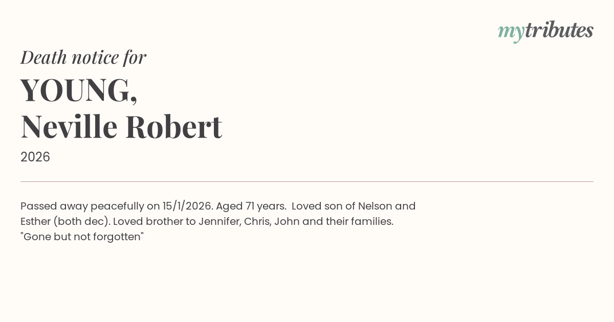 Passed away peacefully on 15/1/2026. Aged 71 years. Loved son of Nelson and