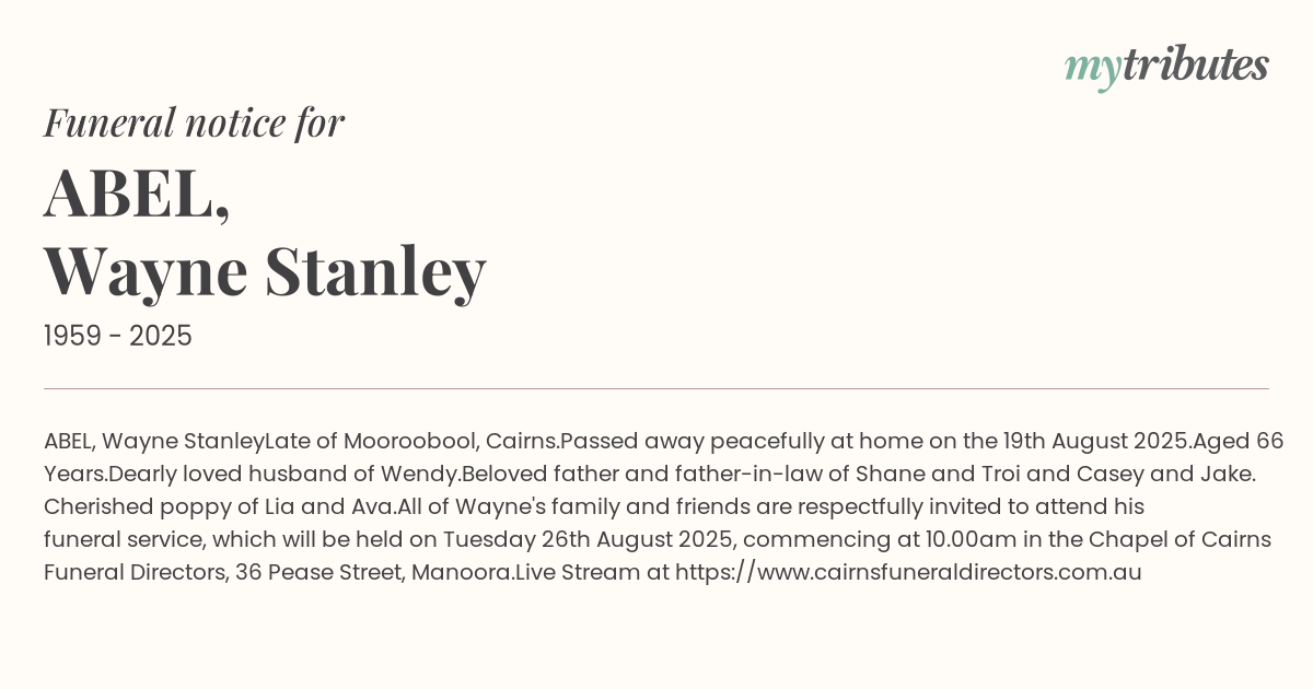 All of Wayne's family and friends are respectfully invited to attend his funeral service, which will be held on Tuesday 26th August 2025, commencing at 10.00am in the Chapel of Cairns Funeral Directors, 36 Pease Street, Manoora.