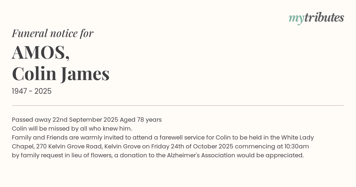 Family and Friends are warmly invited to attend a farewell service for Colin to be held in the White Lady Chapel, 270 Kelvin Grove Road, Kelvin Grove on Friday 24th of October 2025 commencing at 10:30am
