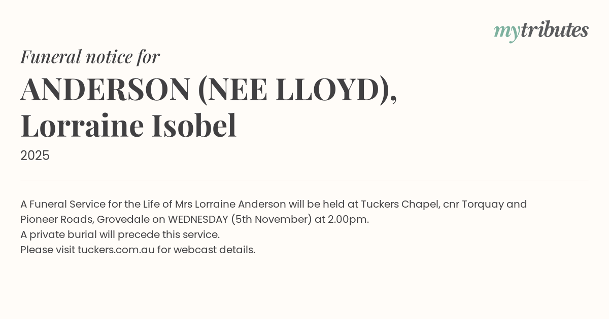 A Funeral Service for the Life of Mrs Lorraine Anderson will be held at Tuckers Chapel, cnr Torquay and Pioneer Roads, Grovedale on WEDNESDAY (5th November) at 2.00pm.