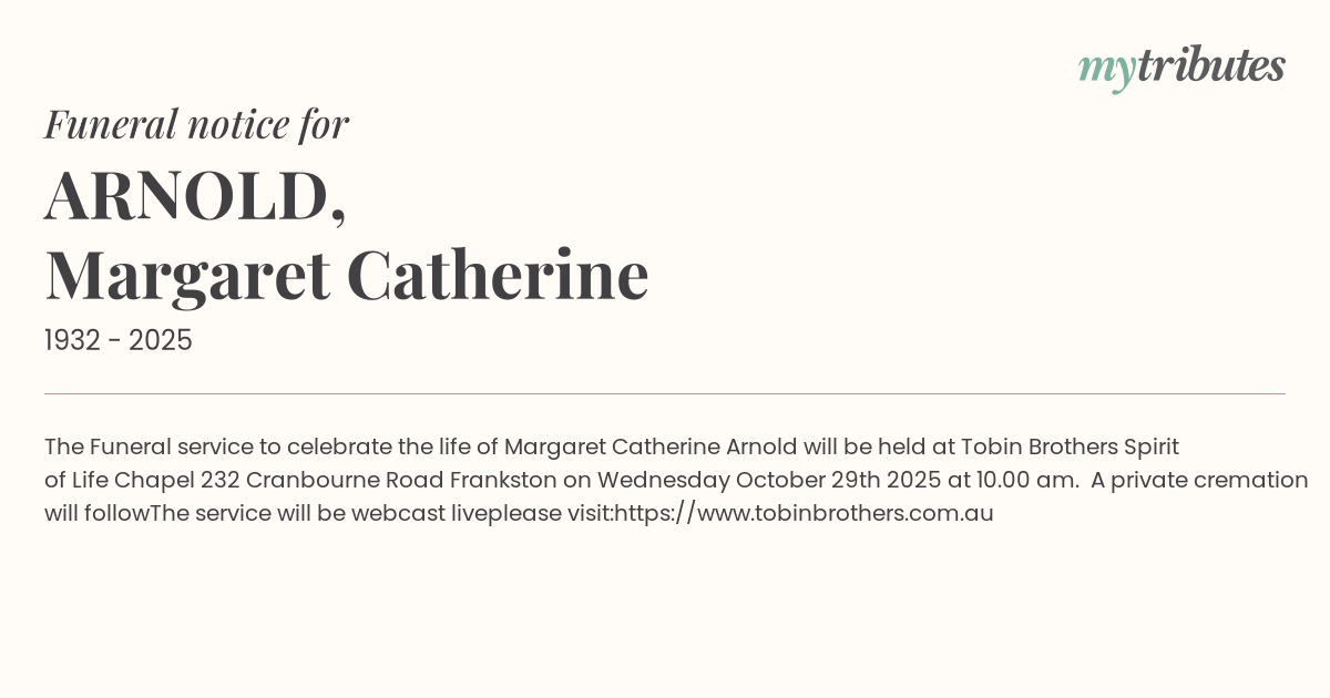 The Funeral service to celebrate the life of Margaret Catherine Arnold will be held at Tobin Brothers Spirit of Life Chapel 232 Cranbourne Road Frankston on Wednesday October 29th 2025 at 10.00 am.