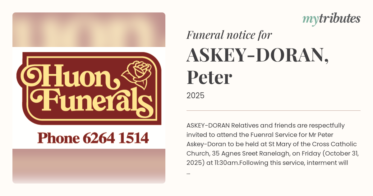 Relatives and friends are respectfully invited to attend the Fuenral Service for Mr Peter Askey-Doran to be held at St Mary of the Cross Catholic Church, 35 Agnes Sreet Ranelagh, on Friday (October 31, 2025) at 11:30am.