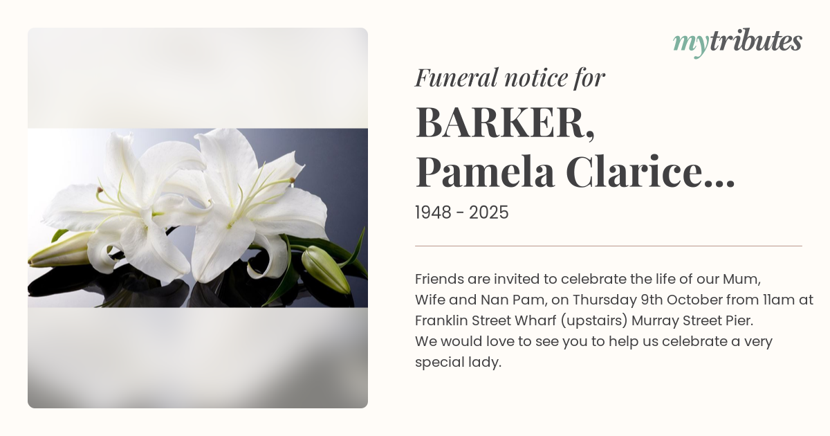 Friends are invited to celebrate the life of our Mum, Wife and Nan Pam, on Thursday 9th October from 11am at Franklin Street Wharf (upstairs) Murray Street Pier. We would love to see you to help us celebrate a very special lady.