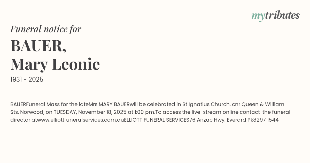 will be celebrated in St Ignatius Church, cnr Queen & William Sts, Norwood, on TUESDAY, November 18, 2025 at 1:00 pm.