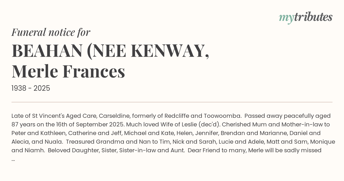 Much loved Wife of Leslie (dec'd). Cherished Mum and Mother-in-law to Peter and Kathleen, Catherine and Jeff, Michael and Kate, Helen, Jennifer, Brendan and Marianne, Daniel and Alecia, and Nuala. Treasured Grandma and Nan to Tim, Nick and Sarah, Lucie and Adele, Matt and Sam, Monique and Niamh. Beloved Daughter, Sister, Sister-in-law and Aunt. Dear Friend to many, Merle will be sadly missed by all who knew her.