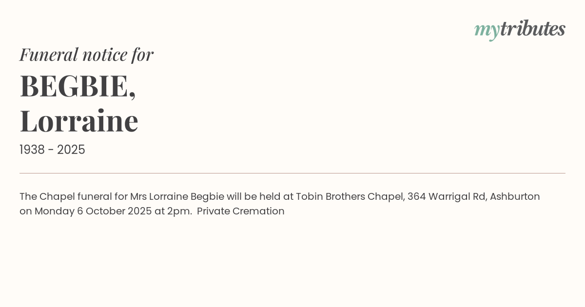 The Chapel funeral for Mrs Lorraine Begbie will be held at Tobin Brothers Chapel, 364 Warrigal Rd, Ashburton on Monday 6 October 2025 at 2pm.