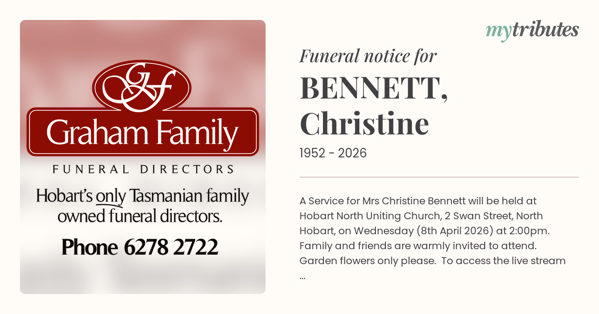 A Service for Mrs Christine Bennett will be held at Hobart North Uniting Church, 2 Swan Street, North Hobart, on Wednesday (8th April 2026) at 2:00pm. Family and friends are warmly invited to attend. Garden flowers only please. To access the live stream of this service please go to https://www.grahamfamilyfunerals.com.au/funerals. Private Cremation.