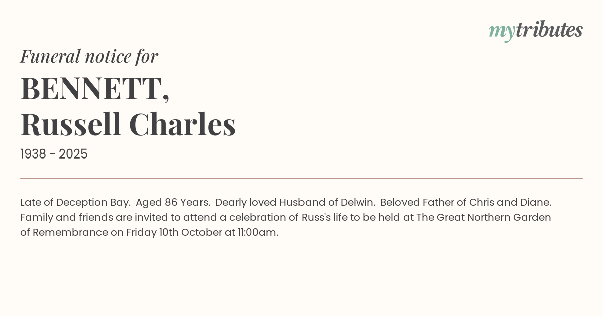 Late of Deception Bay. Aged 86 Years. Dearly loved Husband of Delwin. Beloved Father of Chris and Diane. Family and friends are invited to attend a celebration of Russ's life to be held at The Great Northern Garden of Remembrance on Friday 10th October at 11:00am.